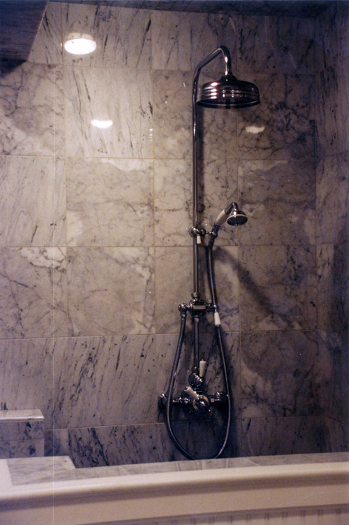 - Marble tile floor and shower